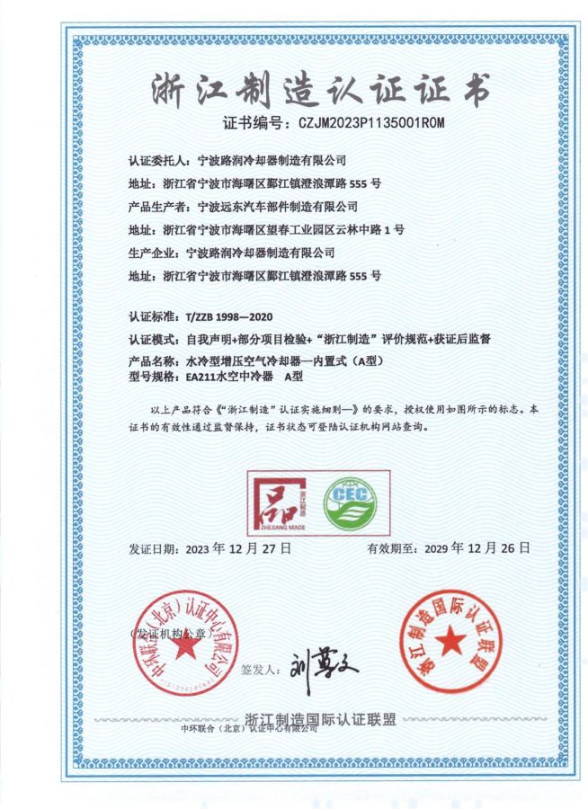 寧波路潤冷卻器制造有限公司自主創(chuàng)新研發(fā)的水冷型增壓空氣冷卻器一內(nèi)置式(A型),以品質(zhì)優(yōu)、技術(shù)新和過硬的產(chǎn)品質(zhì)量,并按照浙江制造的“國內(nèi)一流,國際先進”的定位,經(jīng)過“基本要求、技術(shù)要求、試驗方法、檢驗規(guī)則和質(zhì)量與服務(wù)承諾等方面的審定,獲得“品字標(biāo)浙江制造”認證。